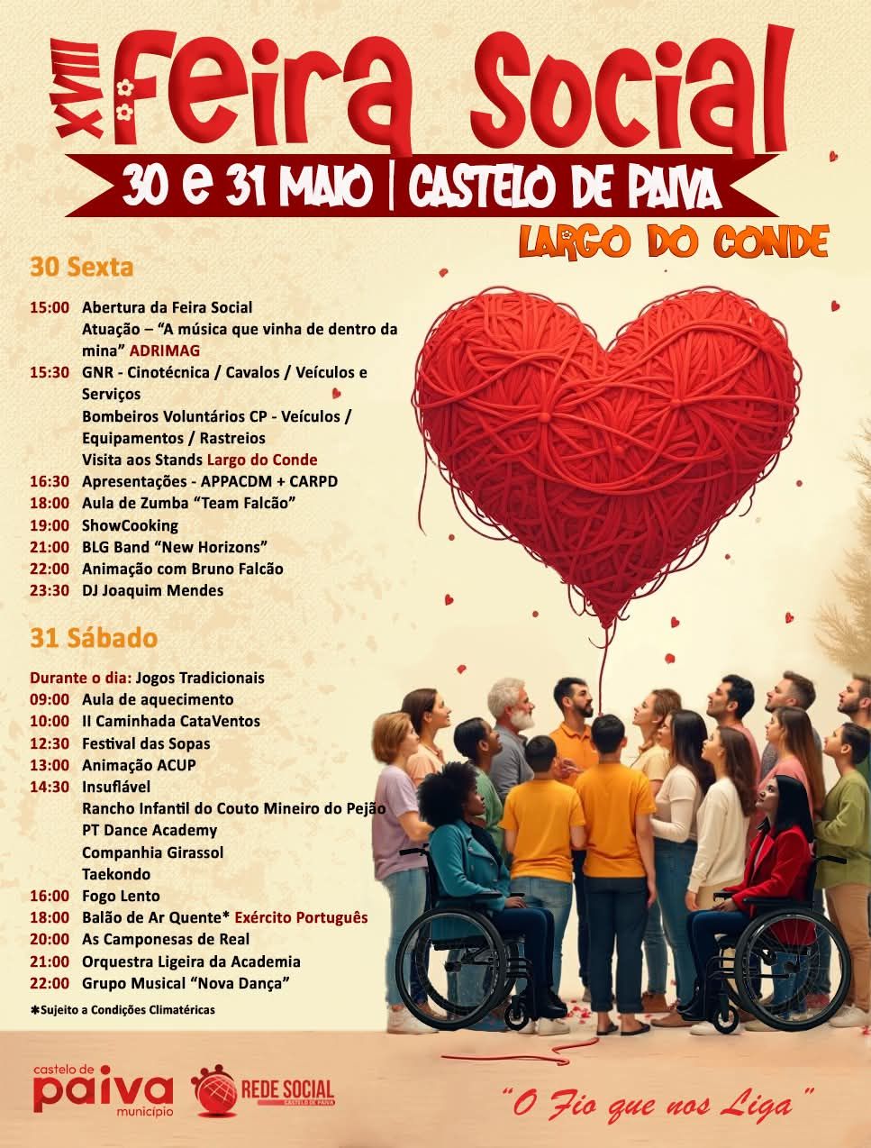 Nesta edição da Feira Social, o programa arranca na Sexta-Feira, dia 30 de Maio e contempla a partir das 15 horas, a actuação “A música que vinha de dentro da mina “, com o apoio da ADRIMAG, e um pouco mais tarde, demonstrações cinotécnicas, cavalos, veículos e serviços, com a participação da GNR e dos Bombeiros Voluntários de Castelo de Paiva, seguindo-se o habitual périplo pelos expositores das entidades presentes neste certame social.